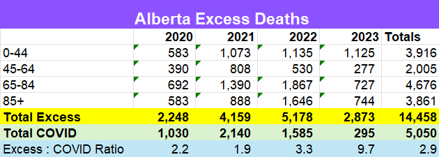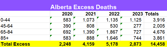 Looking at the totals in the final column, you can see Alberta is nearing 15,000 total Excess Deaths, with the year's figures not completed. About one third of those are people 44 or younger, so the Excess Deaths crisis effects all ages.